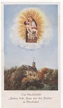 In the course of the French Revolution, the church was desecrated in 1793 and pilgrimages came to a standstill. The new revolutionary owners temporarily used it as a guard room and powder magazine. Ultimately, the chapel was reconsecrated in 1804, and regular services resumed. A quarter century later in 1829, the famous votive picture "Our Lady with the Arrows" arrived at the chapel from the Gräfinthal monastery.[2] Pilgrimage to the chapel was revived in 1913 - this time with a focus on the votive image of the Madonna.[2] Since that time, the little church has been one of the most famous pilgrimage sites in the Roman Catholic Diocese of Speyer.
