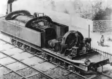 The steam engine drove directly a direct current dynamo,[7] rated at approximately 500 kW (1,200 A @ 400 V); it was a six pole machine with the armature constructed on the Gramme dynamo principle with six brushes.[10] The generator's field coils were energised by a separate bipolar dynamo capable of generating 100 A at 100 V (10 kilowatts (13 hp)), which was directly driven at approximately 300 rpm by a 20 CV two cylinder vertical compound steam engine of similar design to the main engine. This secondary generator's output was also used to provide a supply for electric lighting in carriages.[10]