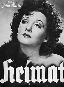 Heimat is a 1938 German historical drama film directed by Carl Froelich and starring Zarah Leander, Heinrich George and Ruth Hellberg. The film's melodramatic storyline portrays the return of a leading singer to her hometown, where her father wishes her to settle down and marry. It is based on the 1893 play Heimat by Hermann Sudermann.[1]