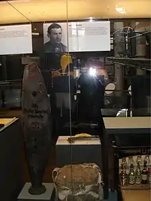 As part of the group expansion from three Staffeln per Gruppe to four Staffeln per Gruppe, Bartels' 11. Staffel was re-designated and became the 15. Staffel of JG 27.[46] In mid-November, the Gruppe was reequipped with the Bf 109 G-10 fighter aircraft.[47] Bartels claimed the destruction of a P-51 fighter on 8 December.[48] Ten days later, he again shot down a P-51 in the combat area near Cologne.[49] On 23 December 1944, Bartels took off for his last and fatal mission. After he shot down a P-47,[50] he was most likely shot down himself by P-47 fighters of the USAAF 56th Fighter Group. His victor may have been Colonel David C. Schilling who claimed five aerial victories that day.[51] Some 24 years later, on 26 January 1968, Bartels' Bf 109 G-10 (Werknummer 130 359) "Yellow 13" was found near Castle Gudenau in Villip, close to Bad Godesberg.[52][53] In its cockpit was Bartels' remains and his intact parachute, which is currently on display at the Deutsches Technikmuseum Berlin. His last rank was Oberfeldwebel (technical sergeant).[2]