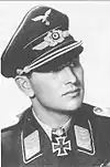 The Knight's Cross of the Iron Cross (German: Ritterkreuz des Eisernen Kreuzes) and its variants were the highest awards in the military of Nazi Germany during World War II. The Knight's Cross of the Iron Cross was awarded for a wide range of reasons and across all ranks, from a senior commander for skilled leadership of his troops in battle to a low-ranking soldier for a single act of extreme gallantry.[1] Presentations were made to members of the three military branches of the Wehrmacht—the Heer (Army), Kriegsmarine (Navy) and Luftwaffe (Air Force)—as well as the Waffen-SS, the Reichsarbeitsdienst (RAD—Reich Labour Service) and the Volkssturm (German national militia). There were also 43 recipients in the military forces of allies of Nazi Germany.[2]