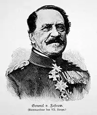 During the Austro-Prussian War Heinrich von Zastrow commanded 11th Division part of Second Army. He participated in the Battle of Königgrätz. During the battle, his division captured Nedeliste.[2] On 16 September 1866, Zastrow was awarded the Pour le Mérite.[3] When the Franco-German War erupted in 1870 Zastrow was given command of VII Corps (part of Steinmetz's First Army), with which he distinguished himself at Spicheren, Gravelotte and the siege of Metz. After the fall of Metz Zastrow besieged Thionville, Montmédy and Mézières. In the last phase of the war VII Corps was part of Manteuffel's Army of the South. After the end of the war he was given a dotation of 100.000 thaler in recognition of his service. He retired from the army in 1872.[1]