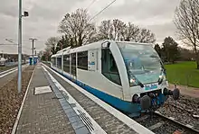The first new reconstruction took place with a view to the upcoming reactivation in February 2010.[10] Hans Joachim Sistenich, then managing director of Aachener Verkehrsverbund (Aachen public transport) and the Zweckverband Nahverkehr Rheinland (Rhineland local transport), explained on 9 March 2010 in the Heinsberg District Office that he had the goal to restore rail services towards Heinsberg from December 2012, initially on part of the line. The financing and all contractual questions were clarified.[11] WestEnergie und Verkehr GmbH (the district-owned utility company) was named as the owner of the rail infrastructure and Rurtalbahn GmbH as the operator of the infrastructure. In addition, the line would be electrified. With effect from 31 December 2010, the ownership of the line passed from DB Netz to WestEnergie und Verkehr, which purchased the line in order to lease it to Rurtalbahn.[12] In the list of railway infrastructure companies of the Federal Railway Authority (Eisenbahn-Bundesamt), the railway infrastructure company responsible for the line is listed as Rurtalbahn GmbH.