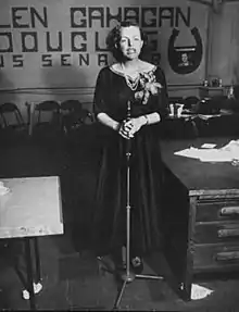 In 1943, Democratic leaders, including FDR, persuaded Gahagan to run in the 1944 election[12] for the California's 14th congressional district seat opened by the retiring Congressman.[20] To try to appeal to conservative voters, she started using her husband's last name.[12] As the California Democratic committee chairwoman, she spoke at the 1944 Democratic National Convention in Chicago.[23] Her impressive speech raised her profile, with some imagining a VP spot in her future, if not a presidential candidacy.[18] In the fall elections, Gahagan Douglas won the House race and subsequently ran for - and won - two more terms, serving in the 79th, 80th and 81st Congresses (January 1945 – January 1951).[24][21] During her three terms in the House, she championed various issues, such as civil rights, migrant worker welfare,[18] women's issues, affordable housing, progressive taxation,[18] and nuclear disarmament; "she was the first to sponsor an anti-lynching bill".[12] She also championed a controversial Franklin Delano Roosevelt National Forest House bill to protect California redwoods from Sonoma County to Oregon. The forest bill was opposed locally by business interests fearing the loss of taxable properties.[25][26]