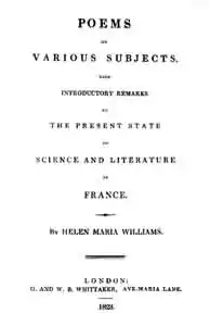 Helen Maria Williams (17 June 1759 – 15 December 1827[1]) was a British novelist, poet, and translator of French-language works. A religious dissenter, she was a supporter of abolitionism and of the ideals of the French Revolution; she was imprisoned in Paris during the Reign of Terror, but nonetheless spent much of the rest of her life in France. A controversial figure in her own time, the young Williams was favourably portrayed in a 1787 poem by William Wordsworth.[2]
