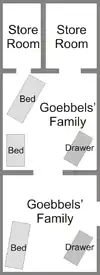 The children seemed unaware of the impending danger, but the eldest child, Helga, seemed to sense that the adults were lying to her about the outcome of the war and asked what would happen to them.[34] Misch was among the last to see the children alive. They were seated around a table in his work area as their mother combed their hair and kissed them, all wearing nightgowns as it was close to their bedtime. Heide, the youngest, had scrambled up onto the table. Helga, whom Misch called the brightest of the children, was "crying softly" just before bedtime on that final night and wore a glum expression. Misch felt Helga had little fondness for her mother. Magda had to push Helga towards the stairs that led up to the Vorbunker. Four-year-old Heide, who had tonsilitis and wore a scarf around her neck, turned back to look at Misch, giggling, and teasingly said, "Misch, Misch, du bist ein Fisch", or "Misch, Misch, you are a fish", just before her mother led her and her siblings upstairs. Misch recalled later that he suspected what was about to happen and would always regret not intervening.[35]