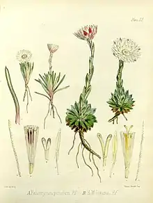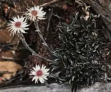 Helichrysum pumilum grows as a low tufted, perennial herb reaching around 10 cm tall. Leaves are linear to spathulate in shape, 15-50mm long and 1-5mm wide with revolute margins. They are grouped in a rosette and arise from the base of the plant. The variety spathulatum has shorter, more spathulate leaves, whilst the leaves of var.pumilum are longer and more linear.[3] Arising from the basally sheathing leaves is an inflorescence containing a white, woolly scape with few leaf-like bracts, 20-100mm long. Forming a rosette around the flower head are elliptic to linear shaped bracts, or phyllaries, resembling the look of ray florets.[4] Outer bracts mostly white in colour but can be streaked with pink, inner bracts are white or pink.[3] The florets are in the form of corolla tubes in the pseudanthium,[3] they are numerous and pink to purple in colour. Flowers in Summer, between December and February.[3]