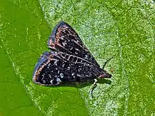 Heliothela wulfeniana has a wingspan of 16–19 mm.[5] The thorax and abdomen of these moths are brownish. Legs are whitish. The upperside of the forewings is dark brownish black, with small metallic lead-gray dots. A showy white spot is present on the paler brown hindwings. The outer margins of the wings are fringed with gray-bluish scales.[4]