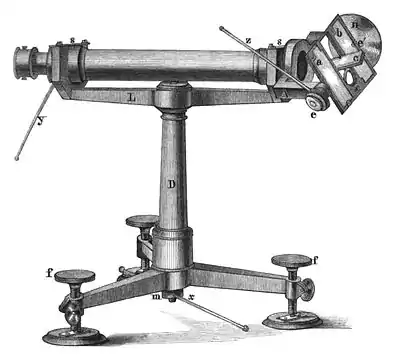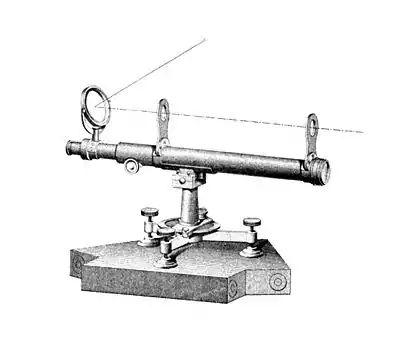 The heliotrope is an instrument that uses a mirror to reflect sunlight over great distances to mark the positions of participants in a land survey. The heliotrope was invented in 1821 by the German mathematician Carl Friedrich Gauss.[1][2] The word "heliotrope" is taken from the Greek: helios (Greek: Ἥλιος), meaning "sun", and tropos (Greek: τρόπος), meaning "turn".