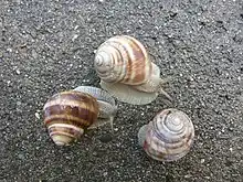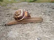 Helix is a genus of large, air-breathing land snails native to the western Palaearctic and characterized by a globular shell.[1][2] It is the type genus of the family Helicidae, and one of the animal genera described by Carl Linnaeus.[3] Members of the genus first appeared during the Miocene.[4] Well-known species include Helix pomatia (Roman snail, Burgundy snail, or edible snail) and Helix lucorum (Turkish snail). Cornu aspersum (garden snail), though externally similar and long classified as a member of Helix (as "Helix aspersa"), is not closely related to Helix[5][6] and belongs to a different tribe of Helicinae.[7]