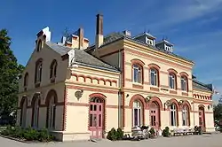 Levanger Station is the most spectacular station on the line and also the best preserved town station. Built entirely in stone, it has a dominant position in town and with a park in front of the station. It was designed in combined Medieval style, with strong elements of Gothic and Romanesque style.[87] Steinkjer Station was the other station entirely built in stone. It has a combined Baroque Revival and Art Nouveau style, and is more anonymous than Levanger Station. Its characteristics were largely lost after it was connected with the bus station.[88] Three stations, Langstein, Skogn and Levanger, have been preserved, while Skatval and Hell have been protected.[89]