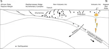 Tomographic data indicate that there is no link between the descending HSZ slab and those associated with either the Calabrian arc to the west or the Cyprus arc to the east.[2] However, a study of earthquake hypocentres suggests that the shallower part of the zone is continuous with the subduction zone west of Cyprus, with a developing slab tear further to the north in its deeper parts.[6] The HSZ slab is divided into two main segments, the western and eastern, with the division between them running roughly north–south through central Crete.[1] The Wadati–Benioff zone for the western segment dips at about 30° over a depth range of 20–100 km and 45° from 100 to 150 km.[7] The boundary between the two is interpreted to be a slab tear.[1]