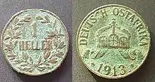 The German heller was resurrected in 1904 when the government took over responsibility for the currency of German East Africa from the German East Africa Company. The heller was introduced as 1/100 of a rupie instead of the pesa, which had been a 1/64 of a rupie up to that time.