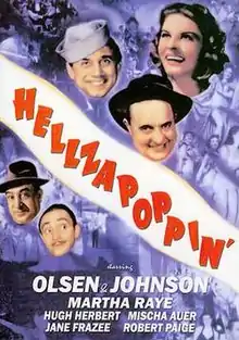 Hellzapoppin' is a 1941 American musical comedy film, and an adaptation of the stage musical of the same name that ran on Broadway from 1938 to 1941. The film is directed by H. C. Potter and distributed by Universal Pictures.[2] Although the entire Broadway cast was initially slated to feature in the film,[3] the only performers from the stage production to appear in the film were lead actors Ole Olsen and Chic Johnson, and the specialty act Whitey's Lindy Hoppers.
