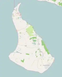 Between Helnæs and the main island of Funen is Helnæs Bay, which contains the sprawling islands of Illumø, Horsehoved and Vigø to the southeast.[1] The principal settlement of Helnæs lies on the southeast coast, and contains the camping site Helnæs Camping to the north of it, although the historical village of Helnæs By is further to the north, inland. The highest point of the island is Galgebakke, at 29 feet (8.8 m).[2]