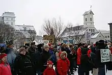 The phrase swiftly became widely used in Iceland in relation to the Crisis, as an expression of widely felt anger at corruption and mishandling of the economy.[7][8] People even made real-life signs bearing the phrase which they took to the protests on Austurvöllur;[9] it was also printed on T-shirts.[10] According to Sóley Björk Stefánsdóttir, the two biggest Facebook groups relating to the Crisis were 'Icelanders are NOT terrorists' (17,188 members) and 'Helvítis fokking fokk' (9,396 members).[11] Describing the city-centre office of the Borgarahreyfingin party, Georg Fornes mentions that 'both inside the place and outside you could see various items from the demonstrations, including pots, cake-tins, and dirty placards with the slogan Helvítis Fokking Fokk!’[12]