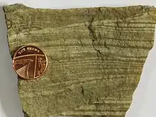 Above these ignimbrites are found sedimentary rocks of the Esk Pike Sandstone Formation. These were deposited in water, probably in a caldera lake, as the volcanic rocks weathered and were eroded. Structures in these rocks suggest the faults were still active and the caldera was still subsiding. Layers of tuff and lapilli-tuff indicate some ongoing volcanism.[43][44]