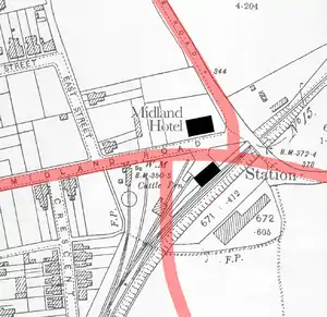 ![]() 1898 OS map showing the location of Hemel Hempsted station (modern road layout is overlaid in red with station and the Midland Hotel marked) | |