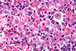 Hemophagocytic lymphohistiocytosis (HLH), also known as haemophagocytic lymphohistiocytosis (British spelling), and hemophagocytic or haemophagocytic syndrome,[1] is an uncommon hematologic disorder seen more often in children than in adults. It is a life-threatening disease of severe hyperinflammation caused by uncontrolled proliferation of activated lymphocytes and macrophages, characterised by proliferation of morphologically benign lymphocytes and macrophages that secrete high amounts of inflammatory cytokines. It is classified as one of the cytokine storm syndromes. There are inherited and non-inherited (acquired) causes of hemophagocytic lymphohistiocytosis (HLH).