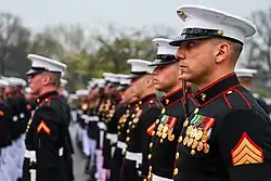 ![]() Marines assigned to the US Marine Corps Honor Guard stand in formation at Joint Base Myer-Henderson Hall in April 2017 | |