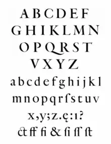 As influences on his types, Lane suggests types by Ameet Tavernier, Robert Granjon and Pierre Haultin,[32] and Vervliet an earlier type cut by Maarten de Keyser.[34][35] His body text type in contrast is more similar to earlier French types by the established French engravers such as Claude Garamond and Granjon.[36][37]