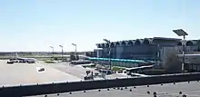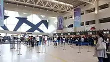 The airport's facilities consist of a single terminal with three main facilities (colloquially referred to as "Terminals"): the Departures Hall/Terminal, the Arrivals Hall/Terminal, and the Finger Terminal (the airside concourse).[16] A walkway with shops connects the departures and arrivals buildings. The airside concourse is organized in two (domestic and international) passengers flows.[17] The entire terminal has 104 check-in desks, 38 gates (of which 14 are equipped with jetways),[13] and a total floor area of 86,000 square metres (930,000 sq ft).[5][12][14]