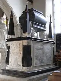 His widow erected in the south aisle chapel of Tawstock Church a large monument to her husband,[lower-alpha 1] deemed "splendid" by Pevsner,[22] "massive and ugly" by Hoskins[23] and "almost unequalled in singularity and absurdity" by Marland.[24] It consists of a free standing base of black and white marble on which sit four white marble dogs supporting on their shoulders a big black square bulging sarcophogus. On each of the four corners is a black obelisk.[22] On the sides of the base is a lengthy epitaph in Latin.[25]
