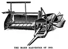 This first reaper-harvester cut the grain with a scalloped edge sickle, and by a double series of toothed bands; one series running on a level with the cutting apparatus, and the other series, running up an inclined plane, carried the cut grain up the inclined plane by way of a revolving apron and deposited it into a rotating receptacle where the sheaf was collected, and thrown upon the ground in circular condition for binding. This was an improvement of earlier reapers where the operator did not have to rake or collect the grain into a sheaf.[1] Ten of these machines were produced and sold in 1849. An improved machine was entered in the 1953 Indiana State Fair held at LaFayette. It won first premium in competition with the popular machines of that day. By the 1870s, around 2,000 reaper machines with the name "J.J.Mann and Sons" were being used.[2]