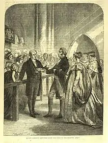 Hood also accompanied the Queen, during her vain attempt to gain admission to the Coronation of George IV in 1821. After some attempts at other entrances, when Hood spoke for the Queen, the Queen's party, with Hood and Lady Anne Hamilton, was headed off by Robert Harry Inglis, Gold Staff Officer to the Coronation. He arrived hurriedly through Old Palace Yard, as they attempted to gain access to Westminster Abbey by an entrance adjacent to Poet's Corner. Inglis had speech with the Queen, the outcome of which was that Inglis called for her carriage to be brought up.[28]
