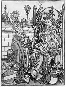 Woodcut of Henry IV of Asberg as a bishop, kneeling before Saint Peter (Michael Wolgemut, reproduced from Buchberger, 1200 Jahre Bistum Regensburg (1939:45).
