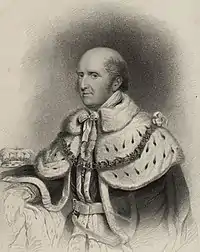 Abergavenny also served as Recorder of Harwich. Around 1790, he rebuilt the family's old house at Eridge[1] and made it his principal seat.[7] In 1803 or 1805, having moved to Eridge Castle, he sold his estate at Kidbrooke, near East Grinstead, to Charles Abbot.[7] On 23 May 1814, Abergavenny was created a Knight of the Thistle.[1] He died on 27 March 1843 at Eridge Castle, and was buried on 4 April 1843 at East Grinstead. His two elder sons having predeceased him, without children, he was succeeded by his third son John.[7]