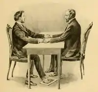 In 1872, Slade was caught in fraud in New York by John W. Truesdell, who had two sittings with him. During the séance Truesdell observed Slade using his foot to move objects under the table, and writing on a slate.[3] In a séance Stanley LeFevre Krebs employed a secret mirror and caught Slade swapping slates and hiding them in the back of his chair.[4]