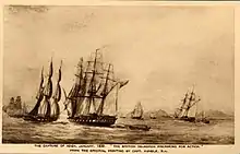 At 9.30 a.m. the rest of the expedition arrived and the warships sailed in close to Aden's batteries to bombard them. By 11 a.m. the gunnery of the ships had demolished Aden's lower batteries and destroyed a large tower, while landing parties ordered by Smith had cleared out the remaining enemy musket men in the rubble.[8] At this point Smith ordered the main two landings of troops to take place, which were completed successfully with two naval casualties and sixteen from the army, with the defending garrison of 1,000 men suffering around fifty casualties.[9] This was the first colonial acquisition of the reign of Queen Victoria.[10] Aden was later purchased by the East India Company and used as a coalling station.[3][9] For his capture of Aden Smith was nominated a Companion of the Order of the Bath on 13 August and received the thanks of the George Eden, 1st Earl of Auckland, the Governor General of India.[3][11]