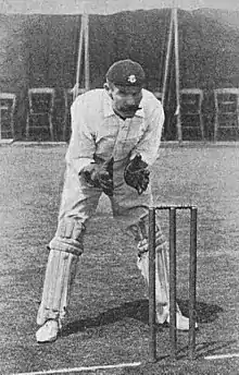Towards the later stages of his career he suffered from failing eyesight, and repeated fractures to his fingers.[6] He averaged 30.26 with the bat in 1895 including four half-centuries, and grew more prolific with the gloves: passing fifty catches in a season in both 1896 and 1897. He batting average otherwise remained in the mid-teens, however, and he played only nine matches in 1900 before his professional playing career ended.[5][10] He became a full-time umpire in 1910, having umpired sporadically as early as 1891, and in total he stood in 94 first-class matches.[15] He died in Waddon, Surrey in 1919.[1]