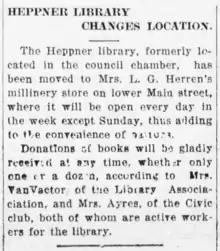- "Library Association Active". Heppner Herald. University of Oregon Libraries; Image provided by: Morrow County Museum; Heppner, OR. 18 February 1919. Retrieved 11 November 2017.