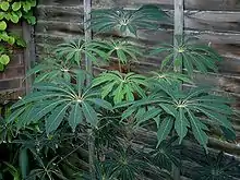 Related to the ivies (Hedera), Heptapleurum taiwanianum is one of several species in the hugely varied genus Heptapleurum that are grown ornamentally for their handsome foliage.[4] Once mature it is hardy down to −10 °C (14 °F), though young plants may require some frost protection. It benefits from being planted in a sheltered spot with other plants to provide enough humidity. It has gained the Royal Horticultural Society’s Award of Garden Merit.[5][6]