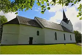 The earliest existing historical records of the church date back to the year 1432, but the church was originally constructed during the second half of the 1100s. The church has a rectangular nave, a tower to the west, and a narrower choir with a semicircular apse. The choir and apse have a lower roof line than the nave. Research on the building has shown that the choir part is the oldest part of the existing building with the apse and nave built a little later. Originally, the current choir was the stone nave that was attached to a wooden building. The wood building was later torn down and the stone building was expanded. Over the years, the church fell into disrepair. During the early 1400s, the western wall of the church was taken down and the stone nave was shortened by about 4 metres (13 ft) and then a new wall was built. In 1879, the church was enlarged by doubling the length the nave (adding about 10 metres (33 ft) to the nave) and then a new west tower was added on the end of the new nave. In the 1960s, the church was thoroughly renovated by the architect John Egil Tverdahl.[3][4]