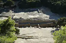The known structures of the sanctuary cover a rectangle approximately 45 metres (148 ft) north–south and 245 metres (804 ft) east–west. The sanctuary wrapped around a small cove and extended toward the east uphill along a ridge. The structures will be discussed in order from west to east.