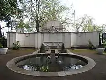 Cheylesmore was honoured Knight Grand Cross of the Order of the British Empire in June 1925.[15] He died a month later aged 77, in a motor accident, the first peer to suffer such a fate in Britain. He was buried in Highgate Cemetery in a grade 2 listed mausoleum designed by the American firm of architects, Carrère and Hastings.[16] The family was desolated and the great ballroom, known as the Pillar Hall at Coopers Hill, which was being built for the coming of age of their heir, was left unfinished.[9] He is commemorated by a monument by Sir Edwin Lutyens in Victoria Embankment Gardens, London.[14] The Cheylesmore Range at Bisley named after him was opened for the 1948 Summer Olympics.