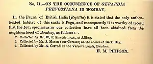 - Phipson, H. M. (1887a), "The poisonous snakes of the Bombay Presidency", Journal of the Bombay Natural History Society, 2 (3): 244–250