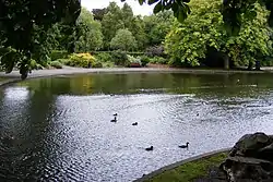 The land used for the park was given to the city by the 14th Earl of Pembroke whose family name was Herbert.[1] In 1907, the World Fair known as the Irish International Exhibition was held in Ballsbridge. When the structures had been dismantled, the site was developed as the current public park, with the bandstand and pond being the only remaining structures from the time. It is now maintained by Dublin City Council.[2] The former site of the Johnston, Mooney & O'Brien bakery bordered the park and when that site was redeveloped as the Herbert Park Hotel,[3] a new entrance was opened at the easternmost end of the park.