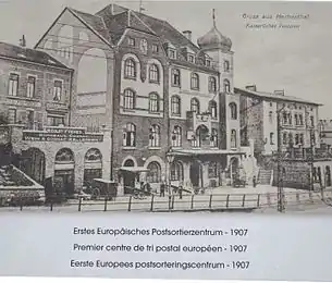 By now a post office had been built at the station, relocated in 1855 from Henri-Chapelle on instructions from the regional head post office at Aachen. At Herbesthal this quickly became one of Europe's busiest mail depots. In 1890 the postal facilities were relocated to a new purposes built post office building beside the station, which would be taken over by the Belgian postal administration in 1920. During the 1920s up to 1,000 mail bags were processed here daily, and it was only after the introduction of so-called mobile sorting offices, using dedicated rail-cars, that the postal facilities at Herbesthal station were removed.