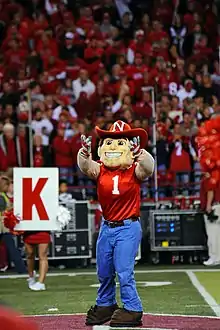 The University of Nebraska–Lincoln cycled through several official mascots before settling on Herbie Husker. The first of these was Corncob Man, a man in green overalls with an ear of corn for a head. After just a few years, the university sought a more "representative" mascot and debuted Huskie the Husker, a farmer who stood ten feet tall and wore overalls with a straw hat on top of a fiberglass head.[2] Huskie soon gave way to Mr. Big Red (more commonly known as Harry Husker); Harry was equally tall but dressed in a blazer and red wide-brim hat. Harry's head was so large it couldn't fit on the team's traveling bus, and it was so heavy the student wearing the costume had to be switched every 45 minutes.[3]