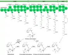 Biosynthesis of herboxidiene has been studied for over 20 years since its discovery. The precursor of herboxidiene, 18-deoxy-25-demethyl herboxitriene was first synthesized in Streptomyces chromofuscus through a nine-modules PKS I pathway. 18-Deoxy-25-demethyl herboxitriene is then epoxidized by enzyme HerE on the carbon carbon double bond between C14 and C15, oxidized by enzyme HerG on C-18 and eventually methylated by enzyme HerF on C25 to herboxidiene with the help of cofactor S-adenosyl methionine (SAM).[5]