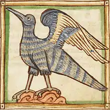 The hercinia is depicted in Medieval bestiaries[1] and was recorded in the 1st century by Pliny the Elder, who wrote, “In the Hercynian Forest, in Germany, we hear of a singular kind of bird, the feathers of which shine at night like fire.”[2] Writing in the 7th century, Isidore of Seville notes, "Their feathers sparkle so much in the shade that, however dark the night is with thick shadows, these feathers, when placed on the ground, give off light that helps to mark the way, and the sign of the glittering feathers makes clear the direction of the path."[3][4]