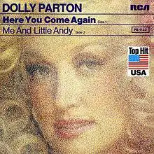 "Here You Come Again" is a song written by Barry Mann and Cynthia Weil, and recorded by American entertainer Dolly Parton. It was released as a single in September 1977 as the title track from Parton's album of the same name, topped the U.S. country singles chart for five weeks, and won the 1978 Grammy award for Best Female Country Vocal Performance; it also reached number three on the U.S. Billboard Hot 100, representing Parton's first significant pop crossover hit.