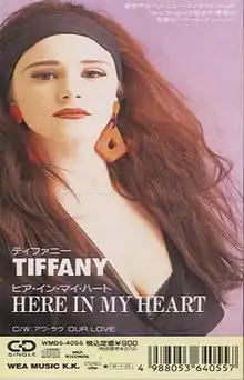 In America, the song was released as a one-track promotional CD single and cassette via MCA, aiming for radio station play only in 1991.[4] For the 1990 Japanese promotional single, "Here in My Heart" was released via WEA Music K.K. as a 3inch CD with a snap-pack picture sleeve design and a promotional sticker on reverse. It featured the B-side track "Our Love" which was taken from the New Inside album.[5] The sleeve design featured a photograph of Tiffany while having a pink background color.[6]