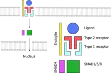 All genes known so far to be linked to HHT code for proteins in the TGF-β signaling pathway. This is a group of proteins that participates in signal transduction of hormones of the transforming growth factor beta superfamily (the transforming growth factor beta, bone morphogenetic protein and growth differentiation factor classes), specifically BMP9/GDF2 and BMP10. The hormones do not enter the cell but link to receptors on the cell membrane; these then activate other proteins, eventually influencing cellular behavior in a number of ways such as cellular survival, proliferation (increasing in number) and differentiation (becoming more specialized).[1] For the hormone signal to be adequately transduced, a combination of proteins is needed: two each of two types of serine/threonine-specific kinase type membrane receptors and endoglin. When bound to the hormone, the type II receptor proteins phosphorylate (transfer phosphate) onto type I receptor proteins (of which Alk-1 is one), which in turn phosphorylate a complex of SMAD proteins (chiefly SMAD1, SMAD5 and SMAD8). These bind to SMAD4 and migrate to the cell nucleus where they act as transcription factors and participate in the transcription of particular genes. In addition to the SMAD pathway, the membrane receptors also act on the MAPK pathway, which has additional actions on the behavior of cells.[2] Both Alk-1 and endoglin are expressed predominantly in endothelium, perhaps explaining why HHT-causing mutations in these proteins lead predominantly to blood vessel problems.[2][8] Both ENG and ACVRL1 mutations lead predominantly to underproduction of the related proteins, rather than misfunctioning of the proteins.[8]