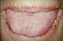 | Characteristic lip telangiectases. | |