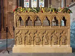 Until its removal in the 1960s there was a wrought iron choir-screen, painted and gilt. Designed by Scott, it was executed by Messrs. Skidmore, of Coventry, from whose works also came the earlier metal screen at Lichfield. After being kept in storage for many years, the screen was completely restored in the late 1990s and re-erected at the Victoria and Albert Museum in London.